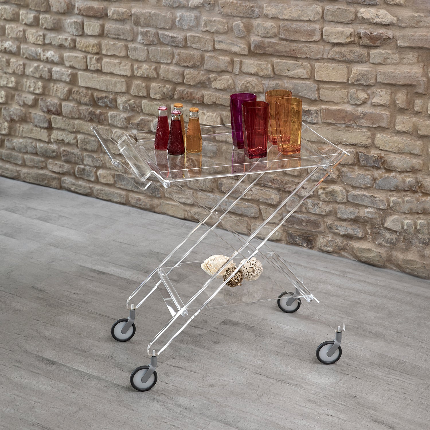 Aurelio è un carrello pieghevole in cristallo acrilico, con doppio vassoio removibile.