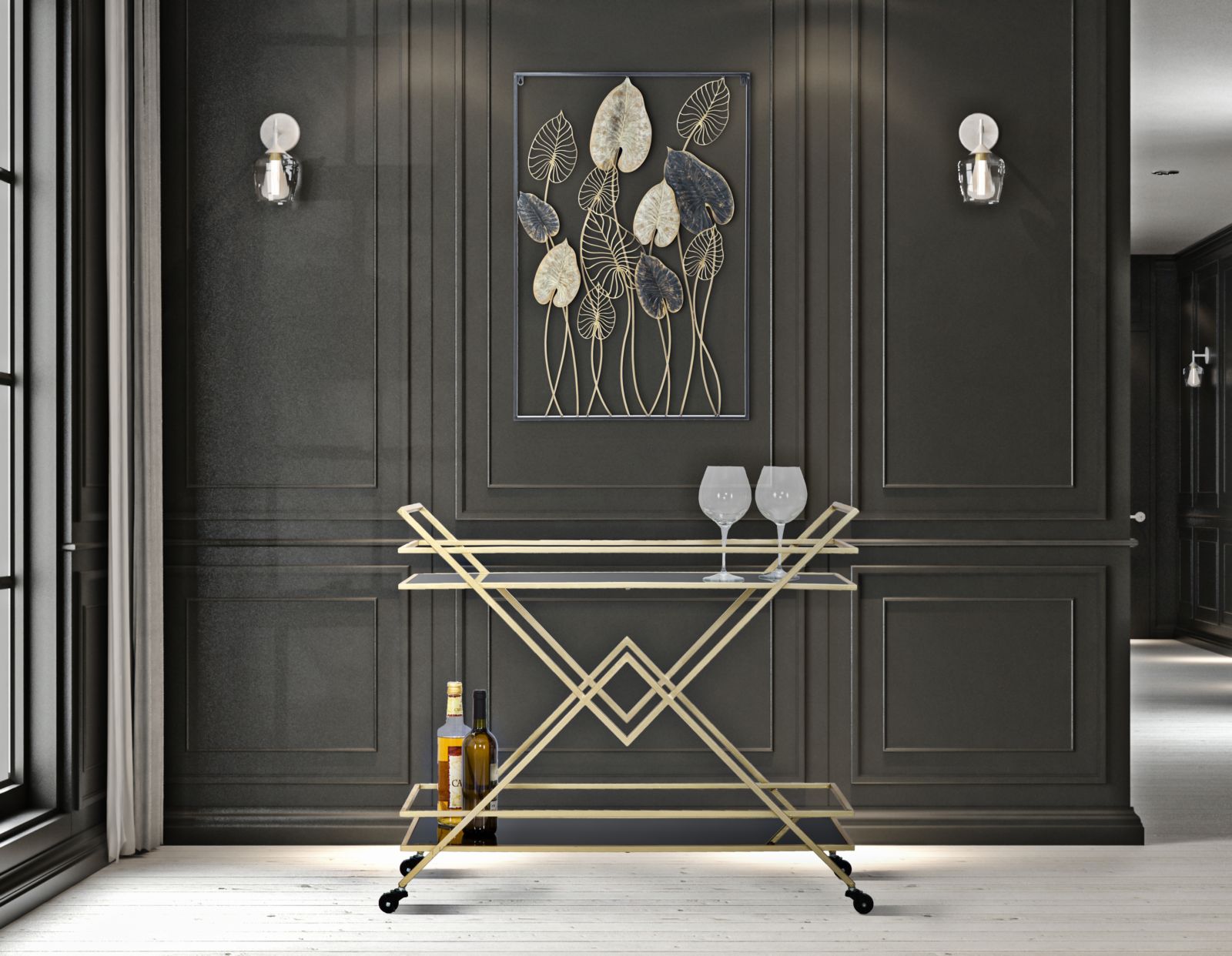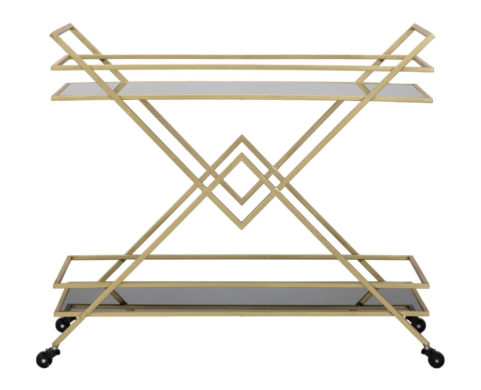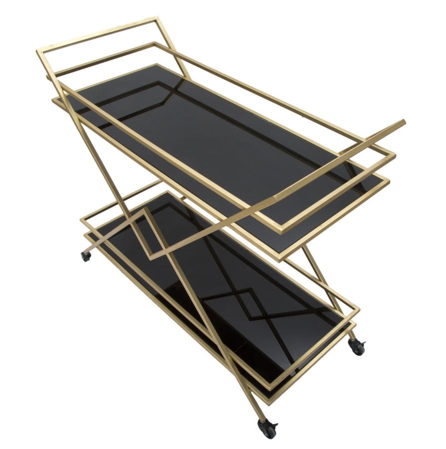 Carrello rettangolare in metallo dorato e vetro temprato nero con 2 ripiani e pratiche ruote. Il contrasto tra il nero e l'oro dona un tocco di classe ad ogni ambiente glam. Le linee geometriche si sposano perfettamente con ogni tipo di arredo.