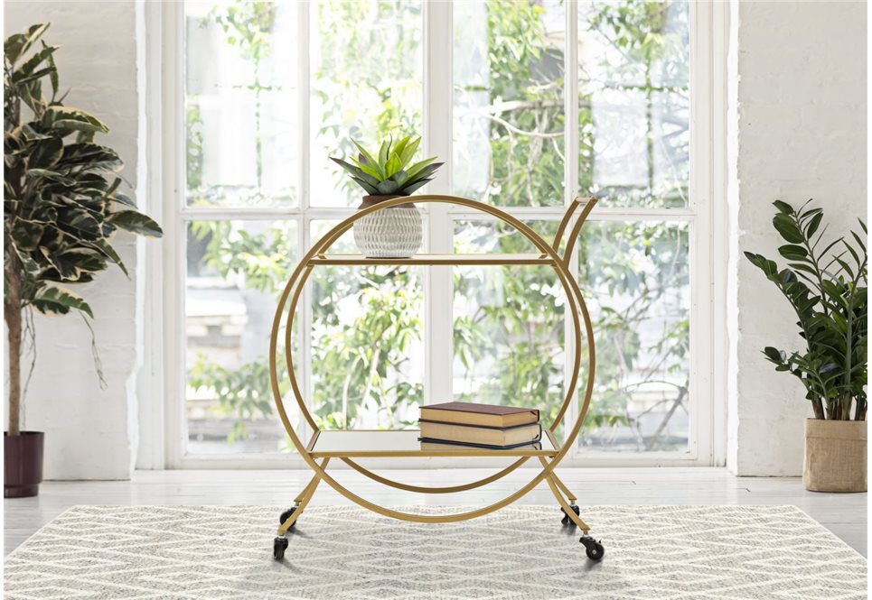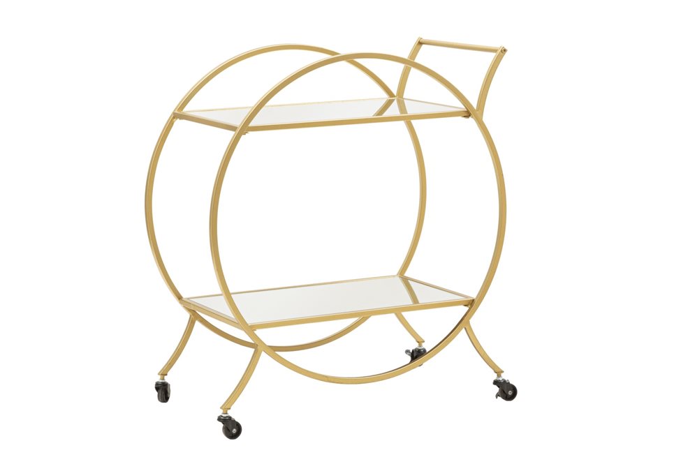 Carrello in metallo dorato con 2 piani in vetro a specchio dal design semplice e lineare. Le linee arrotondate donano morbidezza all'articolo. Completo di pratiche rotelle.