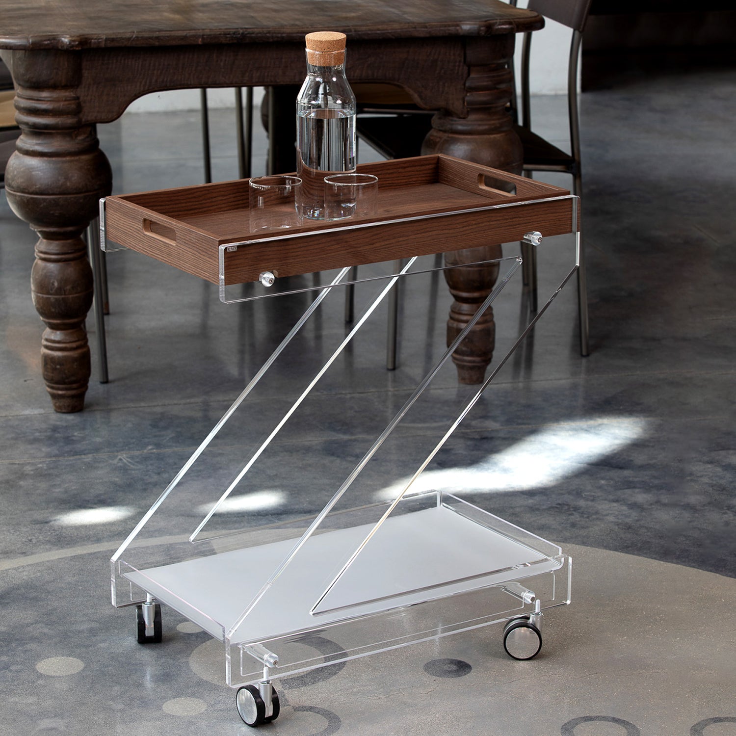 Zeta è un carrello con struttura in cristallo acrilico, e doppio vassoio removibile in legno e plexiglass.