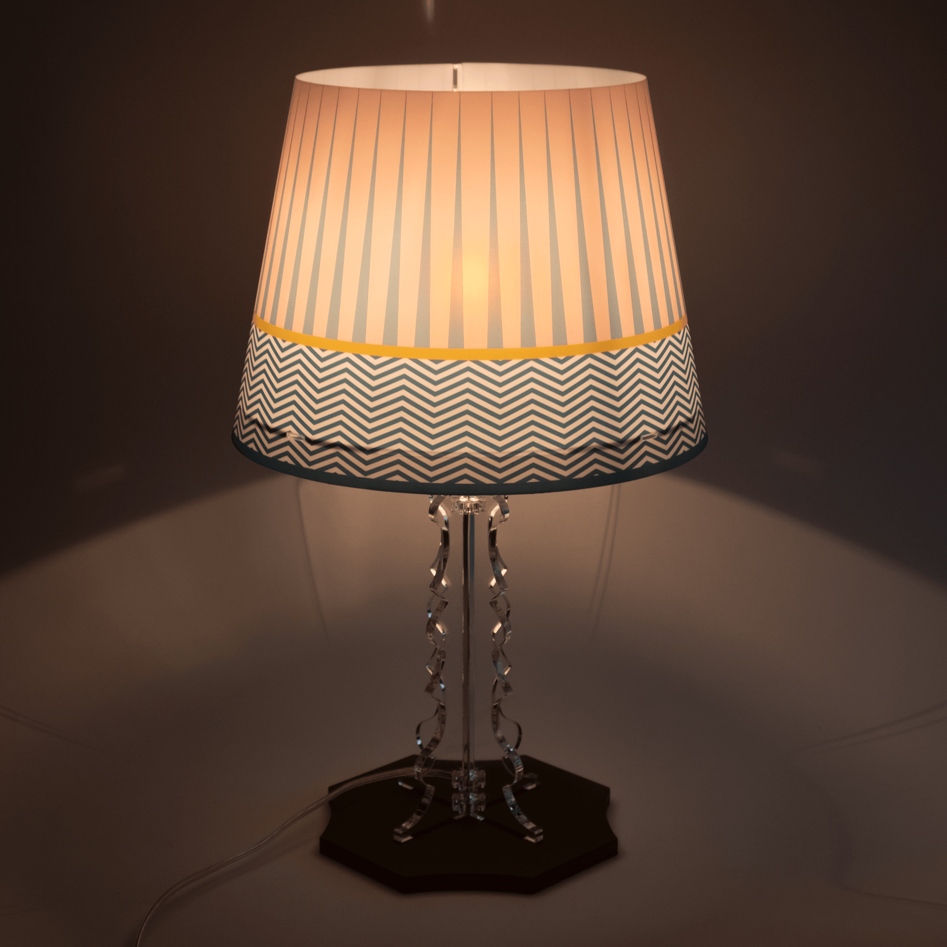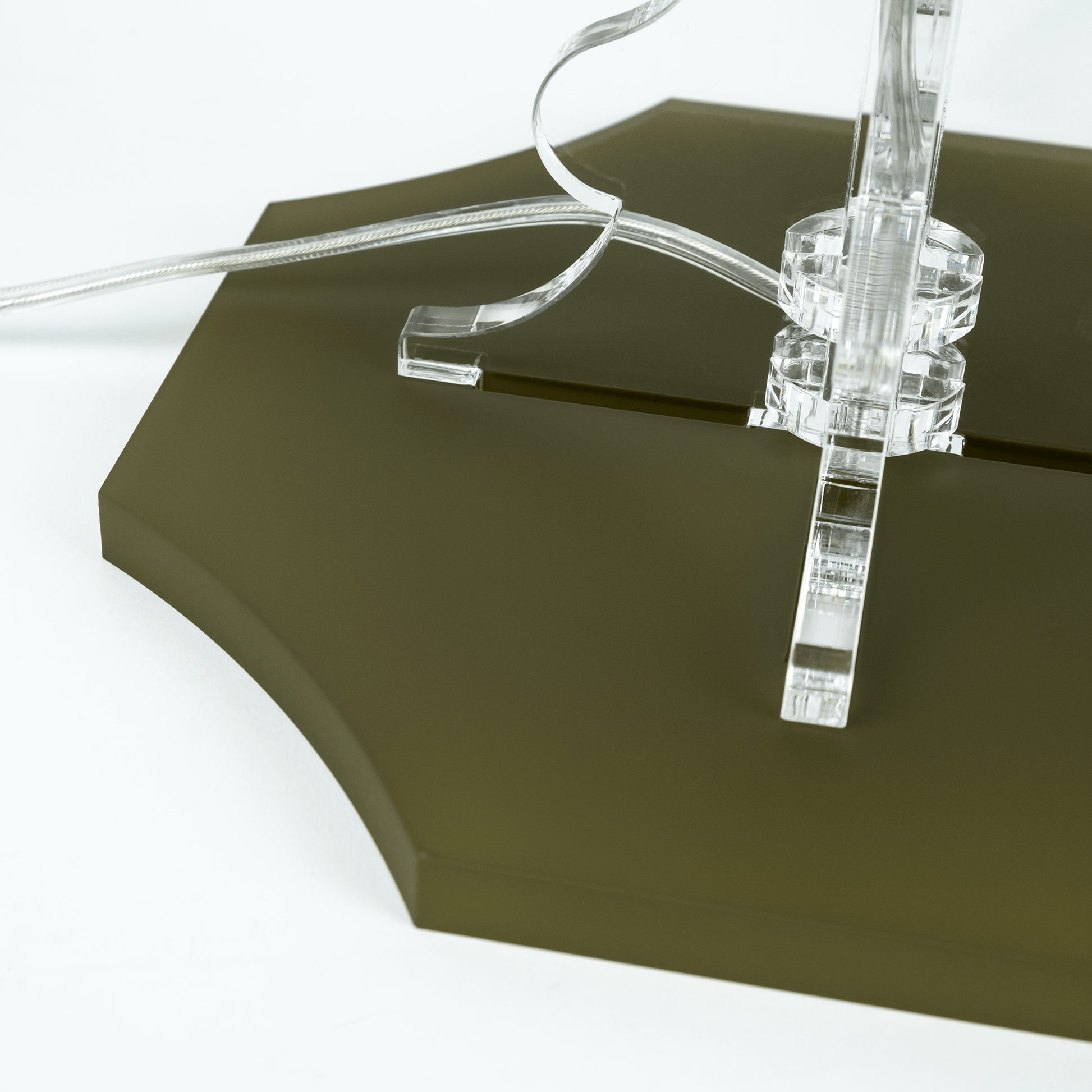 Lampada da tavolo grande con asta in cristallo acrilico, base verniciata soft touch e cappello in polipropilene stampato.