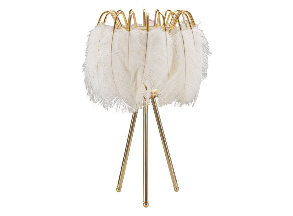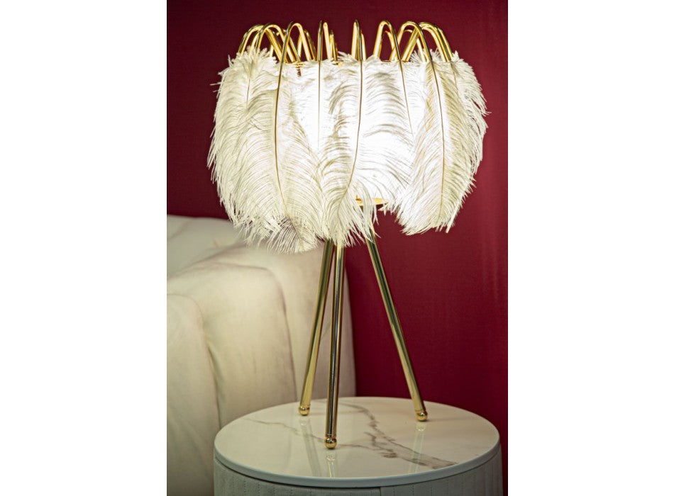 Lampada da tavolo Feather Stand: piantana in metallo dorato con tre aste e paralume di piume bianche. Uno stile glam che porta un tocco di eleganza all’ambiente.