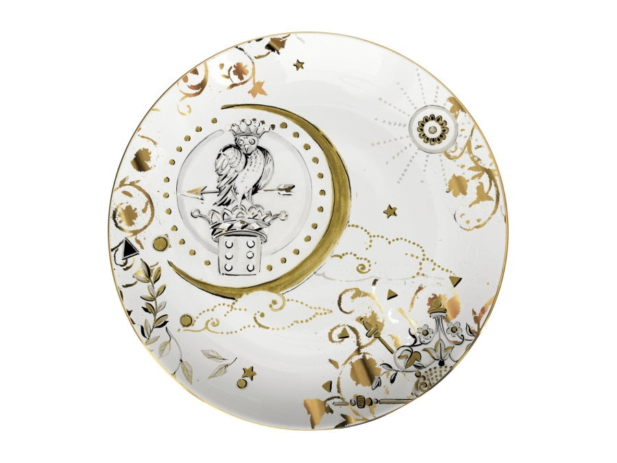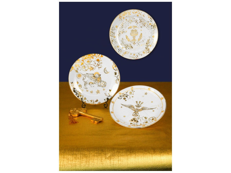 Fili d'oro e tratti leggeri s'intrecciano e ricamano simboli senza tempo, figure capaci di evocare significati celesti.
