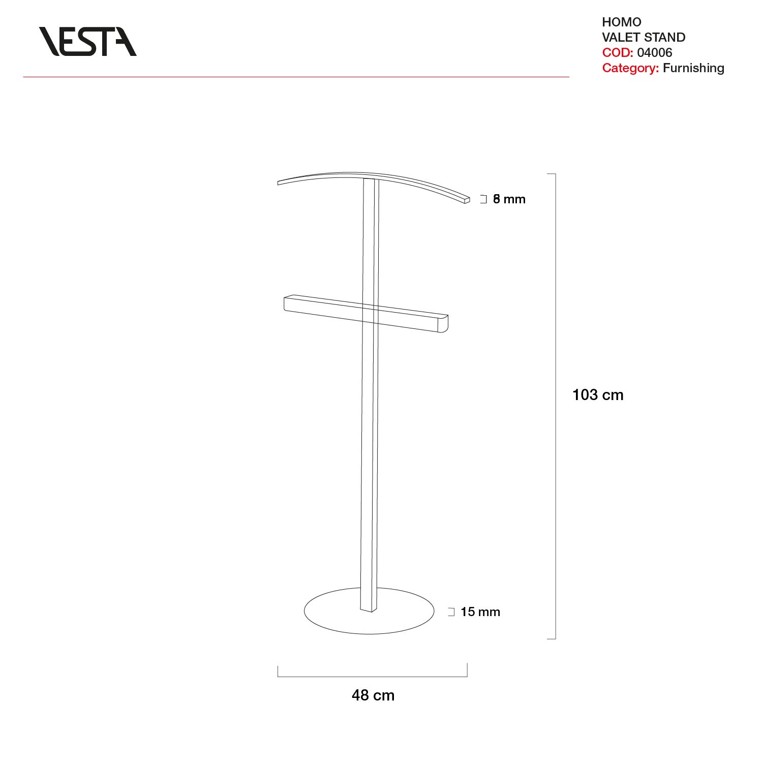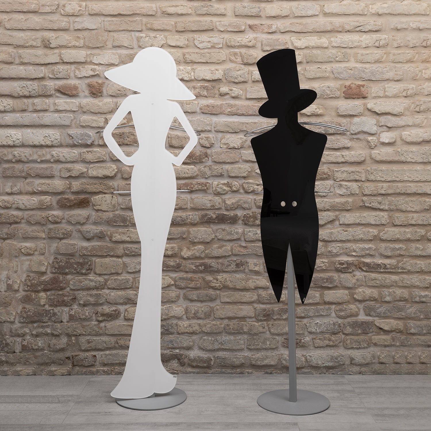 Homo è il servomuto dal design pratico e funzionale: la curvatura della spalla è ideale per riporre cappotti, camicie e maglie che restano stabili senza scivolare; l’asta posizionata di fronte è utile per sorreggere gonne e pantaloni, o anche accessori come cravatte e calze.