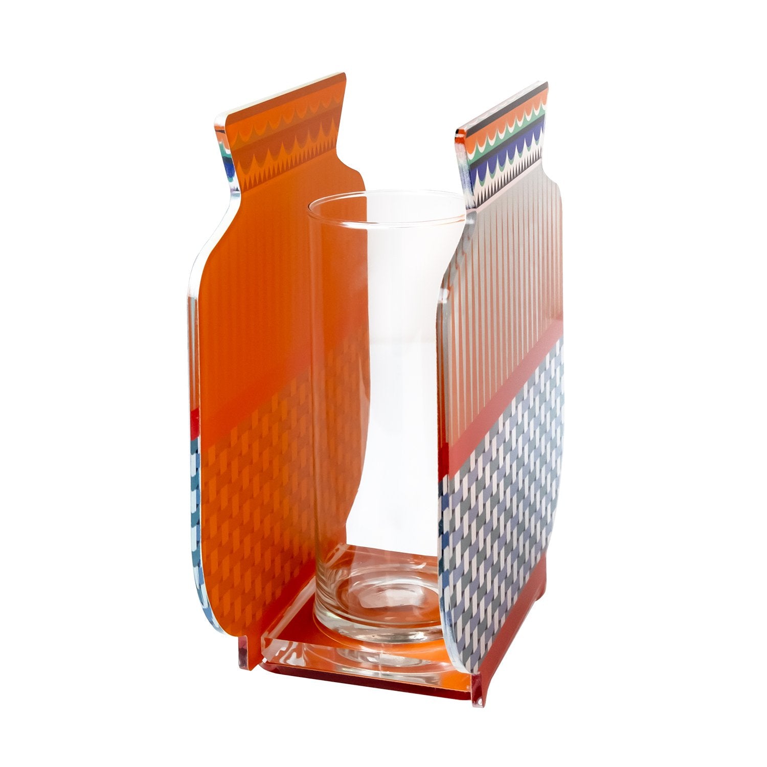Fenice è un coloratissimo vaso portafiori da interno, realizzato in cristallo acrilico stampato e piegato a mano. Al suo interno presenta un vaso in vetro per riporre i fiori.